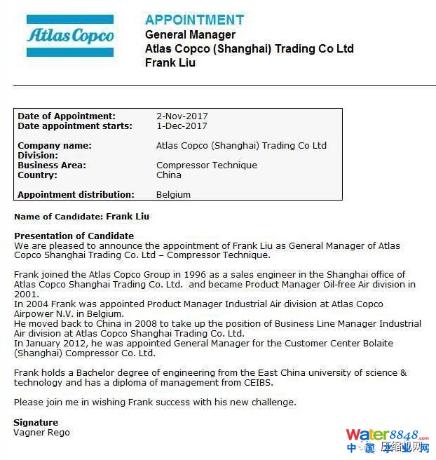 據(jù)悉,由于阿特拉斯·科普柯(上海)貿(mào)易有限公司在壓縮機(jī)領(lǐng)域是集團(tuán)內(nèi)僅次于美國(guó)的第二大客戶中心,此職務(wù)對(duì)集團(tuán)來(lái)說(shuō)至關(guān)重要。自阿特拉斯·科普柯于上世紀(jì)八十年代再次進(jìn)入中國(guó)市場(chǎng)以來(lái),始終由資深外籍高管擔(dān)任,這次是有史以來(lái)首次由中國(guó)人出任,充分體現(xiàn)了阿特拉斯·科普柯對(duì)中國(guó)市場(chǎng)的重視,以及對(duì)劉宇鏑(Frank Liu)能力的信任和認(rèn)可!
