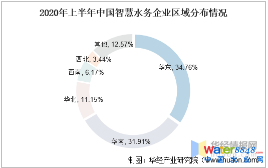 從企業(yè)區(qū)域分布情況來看,地域性特點突出。據(jù)統(tǒng)計,2020年上半年我國智慧水務(wù)相關(guān)業(yè)務(wù)的地域性特點較為突出,行業(yè)企業(yè)主要分布在華南地區(qū)以及華東地區(qū),占比約67%。我國智慧水務(wù)行業(yè)區(qū)域性發(fā)展特征與地區(qū)經(jīng)濟發(fā)展水平與信息技術(shù)發(fā)展水平等息息相關(guān)。