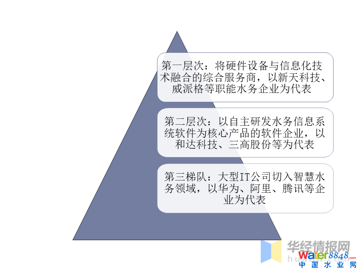 第三類是近年來加快布局智慧水務(wù)業(yè)務(wù)的大型IT公司,如華為、騰訊、阿里等,這些公司有云平臺和大數(shù)據(jù)分析等基礎(chǔ)技術(shù)的優(yōu)勢。