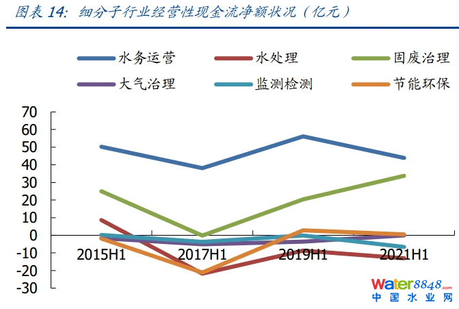 行業(yè)經(jīng)營(yíng)性現(xiàn)金流顯著改善,籌資性現(xiàn)金流大幅上升:2020年環(huán)保行業(yè)經(jīng)營(yíng)性現(xiàn)金流凈額為58.5億元,其中固廢治理板塊33.8億元,較2019年同期大幅上升35.0%,上升幅度最大;水務(wù)運(yùn)營(yíng)板塊達(dá)44.0億元,繼續(xù)保持充沛的經(jīng)營(yíng)性現(xiàn)金流。因?yàn)槠淅贌c危廢資源化這類運(yùn)營(yíng)業(yè)務(wù)強(qiáng)大的現(xiàn)金造血功能, 體現(xiàn)固廢治理板塊經(jīng)營(yíng)成果的改善以及持續(xù)經(jīng)營(yíng)能力的增強(qiáng)。籌資性現(xiàn)金流凈額為128.4億元,投資性現(xiàn)金流凈額為-340.7億元。行業(yè)整體融資好轉(zhuǎn),于籌資現(xiàn)金數(shù)據(jù)上感知明顯,投資性現(xiàn)金流支出額擴(kuò)張。