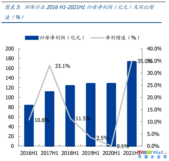 業(yè)績(jī)?cè)鏊俅蠓厣?/span>2021上半年,環(huán)保行業(yè)實(shí)現(xiàn)營(yíng)業(yè)收入1513.9億元,同比增速為28.6%,歸母凈利潤(rùn)173.3億元,同比增速為35.0%,營(yíng)業(yè)收入、凈利潤(rùn)增速顯著回升。一方面,由于2021年疫情影響消退,全面復(fù)工復(fù)產(chǎn),需求恢復(fù),融資環(huán)境改善的利好持續(xù)等趨勢(shì),行業(yè)正增長(zhǎng)趨勢(shì)進(jìn)一步增強(qiáng); 另一方面由于固廢處理、水務(wù)運(yùn)營(yíng)這兩個(gè)細(xì)分子板塊穩(wěn)定且確定的業(yè)績(jī)?cè)鲩L(zhǎng)。同時(shí),部分企業(yè)也完成了亮眼業(yè)績(jī),表現(xiàn)出了較強(qiáng)勁的業(yè)績(jī)恢復(fù)能力,也顯示行業(yè)仍具備較強(qiáng)成長(zhǎng)性。