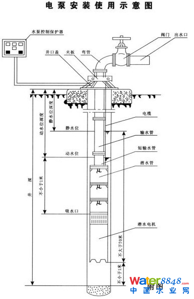 b) . 水泵進(jìn)水口必須在動水位1米位以下,但潛水不得超過靜水位以下70米,電機(jī)下端距井底水深在1米以上。