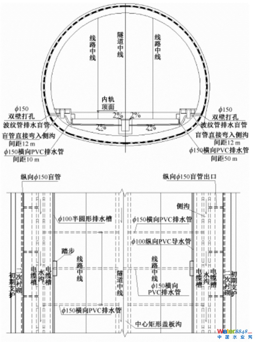隧道襯砌拱墻防水板背后環(huán)向設(shè)置塑料排水板排水,縱向間距36m;防水板下端墻腳處設(shè)置縱向防結(jié)晶HDPE150雙壁打孔波紋管盲管,縱向盲管每隔12m分段引入側(cè)溝。環(huán)向盲溝與縱向盲溝均直接與隧道側(cè)溝連通,便于排水管路的維護。側(cè)溝與中心水溝通過橫向?qū)苓B接,每隔10m設(shè)置一道。仰拱填充靠兩側(cè)溝槽側(cè)壁位置設(shè)置半圓形排水槽,每50m設(shè)置硬質(zhì)PVC排水管與中心蓋板溝連通,以排除隧道內(nèi)道床可能產(chǎn)生積水。