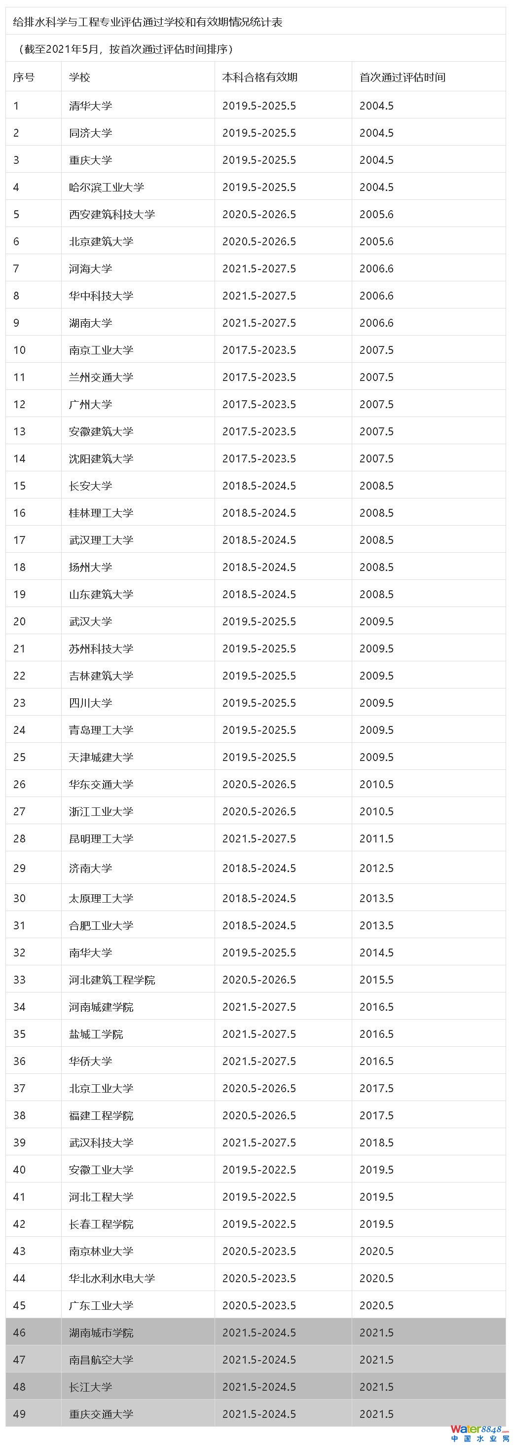 4、給排水科學(xué)與工程專業(yè)評(píng)估通過學(xué)校和有效期情況統(tǒng)計(jì)表(截至2021年5月,按首次通過評(píng)估時(shí)間排序)