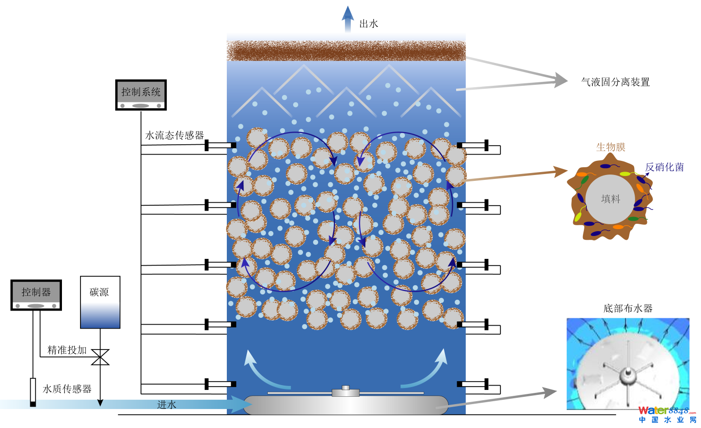 2、 設(shè)計(jì)特異性催化載體,具有適宜的密度,適宜的表面特性,較高的催化活性,比較大的表面積,為反硝化菌提供適宜棲息的環(huán)境,提高微生物活性。