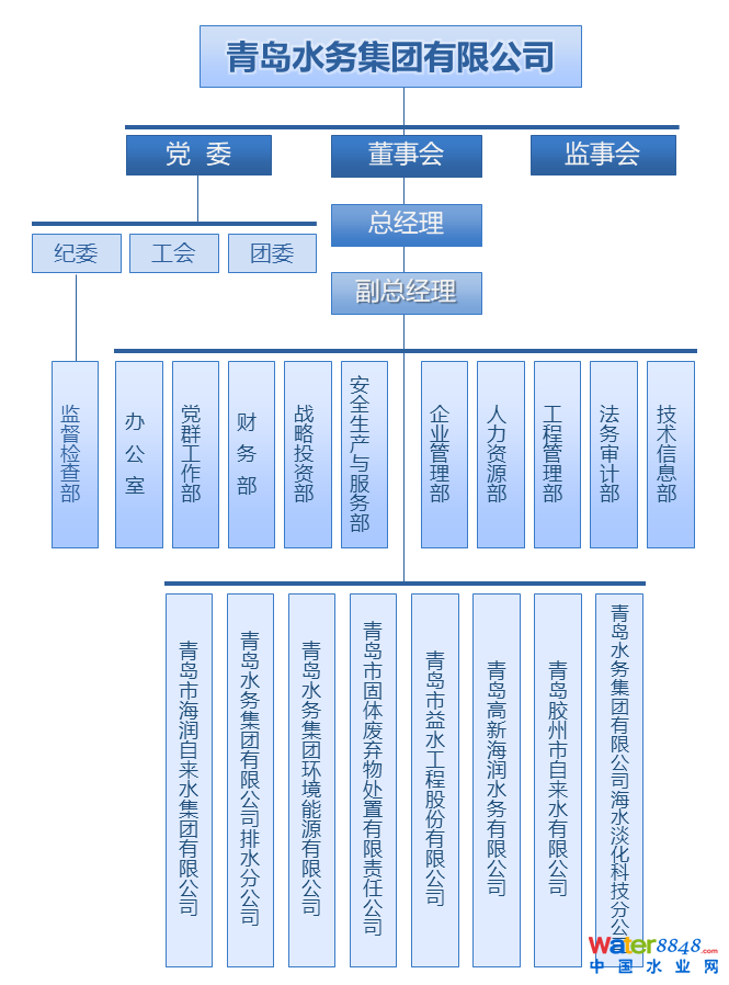 青島水務(wù)集團(tuán)是青島市水務(wù)國有資產(chǎn)管理和基礎(chǔ)設(shè)施投資運營主體,主要從事城鄉(xiāng)水務(wù)項目投資、建設(shè)、設(shè)計、施工、監(jiān)理;城鄉(xiāng)水務(wù)供應(yīng)及系統(tǒng)設(shè)施管理、市政工程設(shè)計及技術(shù)咨詢服務(wù);管道材料設(shè)備銷售;水務(wù)領(lǐng)域投融資及市場開發(fā)運營;房地產(chǎn)開發(fā)等相關(guān)業(yè)務(wù)。目前下設(shè)青島市海潤自來水集團(tuán)有限公司、青島水務(wù)集團(tuán)排水分公司、青島水務(wù)環(huán)境公司、青島水務(wù)建設(shè)公司、青島膠州水務(wù)公司、青島高新海潤水務(wù)有限公司、青島水務(wù)集團(tuán)科技中心、青島水務(wù)集團(tuán)物資中心8個子公司,員工3500余人,其中,博士3人,碩士 48人,大學(xué)本科及以上817人。