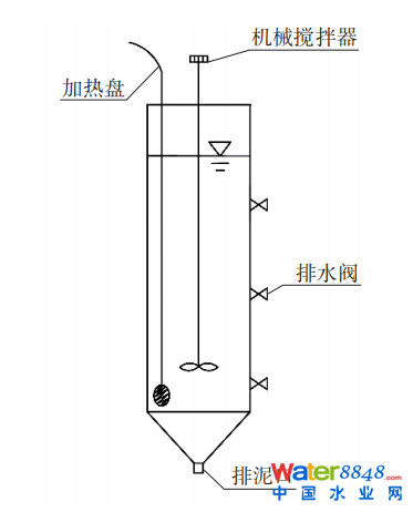 實(shí)驗(yàn)裝置采用SBR反應(yīng)器,由有機(jī)玻璃制成,有效體積為3L,長(zhǎng)為11cm,寬為11cm,高為40cm,見(jiàn)圖1。在反應(yīng)器上方安裝JJ-1型懸臂式攪拌器,攪拌速度為200r/min,以保持反應(yīng)過(guò)程中的完全混合且溶解氧不超過(guò)0.2mg/L。使用哈希HQ30d溶解氧儀測(cè)定溶解氧,雷弗BT100L型蠕動(dòng)泵控制進(jìn)水和碳源投加,德力西2W040-10型電磁閥進(jìn)行排水。使用YX25L型溫控加熱盤控制反應(yīng)器內(nèi)溫度在24~25 ℃。