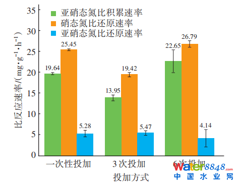 3種投加方式中,6次投加時(shí)NO 3--N比還原速率、NO2--N比積累速率最大,分別為26.79、22.65mg/(g·h),3次投加方式的NO3--N比還原速率、NO2--N比積累速率最小,分別為19.42、13.95mg/(g·h)。此外,無(wú)論何種投加方式,NO3--N比還原速率遠(yuǎn)大于NO2--N比還原速率。一次性投加時(shí),NO3--N比還原速率是NO2--N比還原速率的4.82倍,3次、6次投加時(shí)分別為3.55、6.47倍。6次投加方式的NO3--N比還原速率與NO2--N比還原速率相差最大,NO2--N得以更好地積累,與在該條件下PD系統(tǒng)具有較高的NTR相一致。由此可以認(rèn)為,NO3--N比還原速率大于NO2--N比還原速率是NO2--N積累的直接原因,這與王淑瑩等、Cao等 的研究結(jié)果相似。
