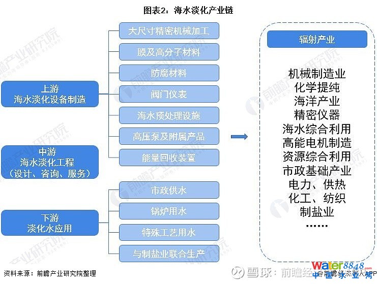 下游淡化水供應(yīng)則涉及市政供水、鍋爐用水特殊工藝用水、與制鹽業(yè)聯(lián)合生產(chǎn)等領(lǐng)域。另外海水淡化產(chǎn)業(yè)還輻射到機(jī)械制造業(yè)化學(xué)提純、海洋產(chǎn)業(yè)等其他產(chǎn)業(yè)。