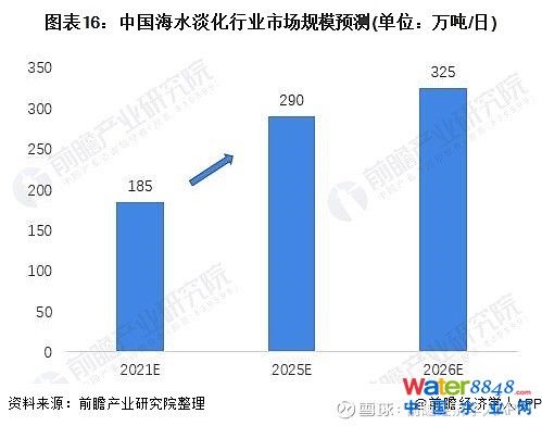 2020年我國(guó)海水淡化總規(guī)模約為165萬(wàn)噸/日。根據(jù)海水淡化利用發(fā)展行動(dòng)計(jì)劃(2021—2025年),到2025年,全國(guó)海水淡化總規(guī)模達(dá)到290萬(wàn)噸/日以上新增海水淡化規(guī)模125萬(wàn)噸/日以上,其中沿海城市新增105萬(wàn)噸/日以上海島地區(qū)新增20萬(wàn)噸/日以上。前瞻預(yù)測(cè)2021年我國(guó)海水淡化總規(guī)模約為185萬(wàn)噸/日,2026年將超過(guò)300萬(wàn)噸/日,達(dá)到325萬(wàn)噸/日左右,年復(fù)合增長(zhǎng)率約為12%。