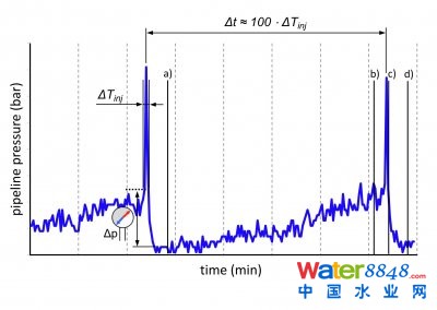 圖2:污泥管道注入點(diǎn)的壓力曲線示意圖。當(dāng)達(dá)到預(yù)定的壓力水平時(shí),注入壓縮空氣幾秒鐘,ΔTinj,之后污泥管道中的壓力下降Δp。然后使用螺桿泵幾分鐘,Δt,將新的污泥栓塞泵入管道,直到進(jìn)行另一次壓縮空氣注入。標(biāo)記的時(shí)間a)...d)對(duì)應(yīng)于圖1所示的條件。