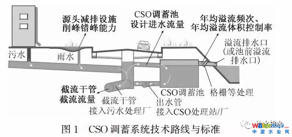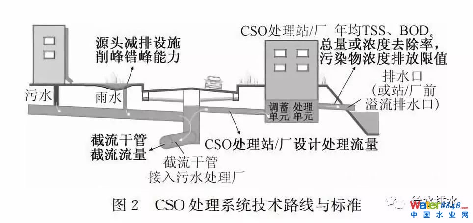 隨著海綿城市建設(shè)的科學(xué)推進(jìn)和相關(guān)研究的不斷深入,我國(guó)對(duì)CSO污染控制技術(shù)體系的梳理和認(rèn)識(shí)逐漸清晰,然而,我國(guó)CSO污染控制的系統(tǒng)性工程實(shí)踐極為不足。CSO控制技術(shù)措施主要包括源頭減排(綠色基礎(chǔ)設(shè)施等)、截流干管和污水處理廠提標(biāo)改造、CSO調(diào)蓄、CSO處理以及非工程措施(如實(shí)時(shí)控制、管網(wǎng)運(yùn)維調(diào)度)等,主要技術(shù)路線與標(biāo)準(zhǔn)如圖1、圖2所示。
