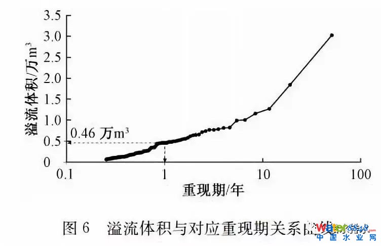 根據(jù)表1,建立溢流體積與對(duì)應(yīng)重現(xiàn)期關(guān)系曲線,如圖6所示,1次/年、2次/年、3次/年、4次/年的年均溢流頻次控制標(biāo)準(zhǔn)對(duì)應(yīng)的溢流體積分別為0.46萬(wàn)m3、0.21萬(wàn)m3、0.11萬(wàn)m3、0.07萬(wàn)m3。若將其初步作為相應(yīng)年均溢流頻次控制標(biāo)準(zhǔn)下的CSO調(diào)蓄池設(shè)計(jì)池容,經(jīng)校核,對(duì)應(yīng)的年均溢流體積控制率可分別達(dá)到77%、53%、37%、27%。