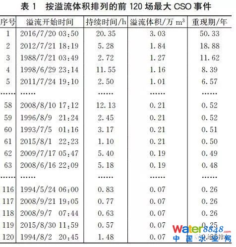 按照溢流體積從大到小將CSO事件進(jìn)行降序排列,并選取前N場(chǎng)最大CSO事件,N=βm,其中,β為每年選取CSO事件的個(gè)數(shù),按年多個(gè)樣法,本案例β取值為4,m為模擬年數(shù)30年。每場(chǎng)CSO事件溢流體積對(duì)應(yīng)的重現(xiàn)期T=(m+1-2α)/(i-α)[9],其中i為CSO事件按溢流體積從大到小排列的序號(hào),α為權(quán)重因子,取04,計(jì)算結(jié)果如表1所示,其中,重現(xiàn)期T也可根據(jù)式T=(mβ+1)/iβ計(jì)算。