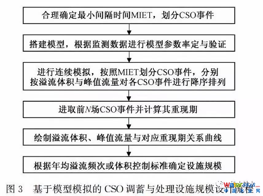 在美國(guó),已有比較成熟的基于設(shè)計(jì)暴雨和模型連續(xù)模擬方法的CSO控制設(shè)施規(guī)模設(shè)計(jì)實(shí)踐,考慮設(shè)計(jì)暴雨法無(wú)法考慮連續(xù)降雨等因素對(duì)控制效果的影響,近些年,一些州多用監(jiān)測(cè)與模型連續(xù)模擬相結(jié)合的方法對(duì)CSO控制設(shè)施的規(guī)模進(jìn)行設(shè)計(jì)。