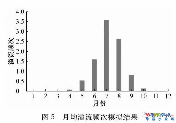 CSO事件劃分后的統(tǒng)計(jì)結(jié)果如圖4、圖5所示。年均溢流頻次為9.4次,其中最大年份為2008年,溢流16次;最小年份為1999年,溢流1次。年均溢流體積為1.45萬(wàn)m3,最大溢流體積為3.64萬(wàn)m3,出現(xiàn)于2016年,6~8月份溢流頻次占年均溢流頻次的比例為83%。