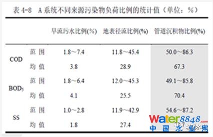 4. 雨天溢流污染太嚴(yán)重。排水管道養(yǎng)護(hù)管理工作最最重要的兩個(gè)字是“清、通”。雨水管是“清”,“清”就是把雨水管道中的積泥“清”出來(lái),讓雨水管做到旱天無(wú)積泥、少積泥!污水管是“通”,把積泥“通”到下游去,進(jìn)到污水處理廠,讓污水管無(wú)淤積、無(wú)堵塞、水暢流!合流管既要“清”、也要“通”,旱天多多“通”,保證低水位時(shí),像污水管一樣,無(wú)淤積、無(wú)堵塞、水暢流;降雨前還應(yīng)該好好再進(jìn)行“清”。雨水管和合流管都有排河道水體的口門(mén),“清”的目的就是雨天少點(diǎn)污染物入河。只有最大限度地減少管道中的積泥,才能夠減少雨天溢流污染?墒俏鬯、合流管和雨水管往往一年四季都是高水位,甚至是滿(mǎn)管流,這就讓“清、通”養(yǎng)護(hù)變得十分困難,就不可能做到有效地將雨水、合流管中的積泥“清出來(lái)”!好比煮了一鍋稀飯,想把米粒都撈干凈,是件很難的事道理是一樣的。圖6是奧地利排水管道中的積泥情況,其大部分管道積泥不超過(guò)管徑的1/40。這比我們養(yǎng)護(hù)后要求積泥厚度不大于1/8可好得多啊!管道積泥少了,合流管、雨水管雨天排水口溢流和出流的污染物就少了。圖7是某平原河網(wǎng)地區(qū)城市雨天排水口出流污染的構(gòu)成,在總污染負(fù)荷中,管道積泥的污染負(fù)荷要占到60%以上,可見(jiàn)合流管道、雨水管道清淤工作的重要性之高。圖8是某山地城市雨天合流制排水口污染物變化情況,COD最高可以高達(dá)2000mg/L之巨。