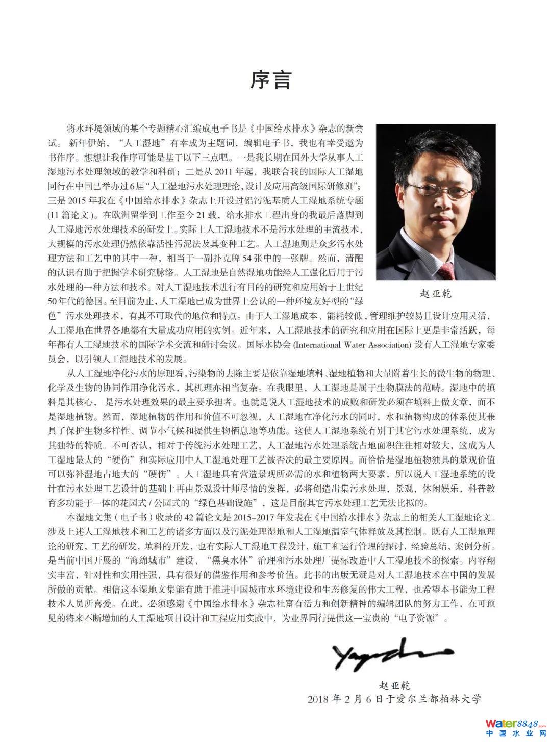 如果您想方便快捷地拿到近年來有關(guān)人工濕地的研究進展和工程應(yīng)用資料,無疑這本新鮮出爐的人工濕地專輯電子書可以幫您一個忙。該專輯將2015—2017年《中國給水排水》發(fā)表的有關(guān)人工濕地的論文進行了梳理、匯編,囊括了“鋁污泥基質(zhì)人工濕地系統(tǒng)”專欄的全部文章,共42篇。本專輯特別邀請愛爾蘭都柏林大學的趙亞乾教授撰寫序言,非常值得一讀!序言全文如下: