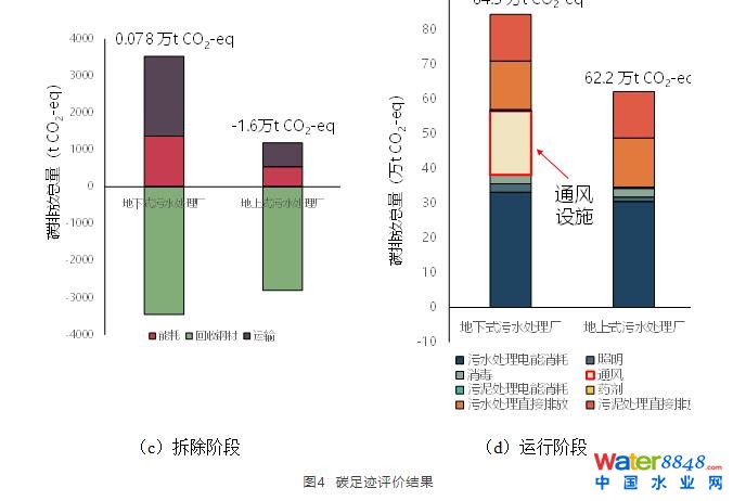 案例污水處理廠全生命周期碳足跡評價(jià)結(jié)果如圖4所示。地下廠全生命周期總碳排放量約87.1 萬t CO2-eq,較地上廠高36.5%,其中,運(yùn)行階段碳排放量可達(dá)總量的95%以上。由于地下工程結(jié)構(gòu),地下廠在建設(shè)(圖6b)與拆除階段(圖6c)中,需要額外的施工量與建材消耗;在運(yùn)行階段(圖6c),則需額外通風(fēng)、照明等電力消耗。因此,地下廠運(yùn)行階段(20年)總碳排放量較地上式高35.8%;其中,地下廠額外通風(fēng)產(chǎn)生的碳排放量約18.4萬t CO2-eq,占總排放量的22%?梢,地下式污水處理廠全生命周期中會(huì)產(chǎn)生大量碳排放,不符合碳減排、碳中和的社會(huì)發(fā)展方向。