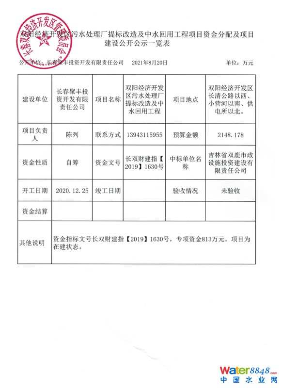 雙陽經(jīng)濟(jì)開發(fā)區(qū)污水處理廠提標(biāo)改造及中水回收工程項(xiàng)目資金分配及項(xiàng)目建設(shè)公開公示一覽表