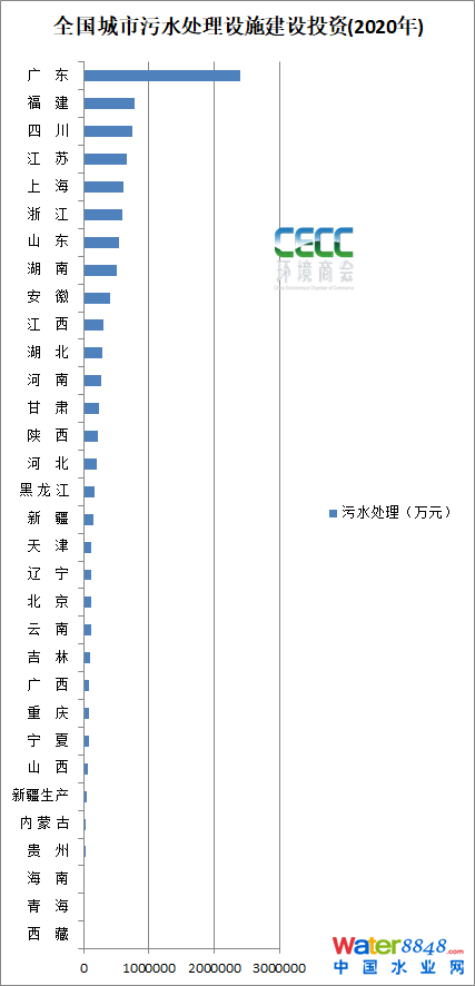 從固定資產(chǎn)投資來看,2020年,廣東省污水設(shè)施建設(shè)投資遙遙領(lǐng)先,接近240億,排在第二、三的福建省和四川省的投資額為78億、75億左右。具體如圖: