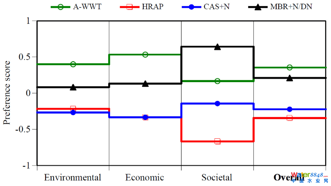 由圖2所示,在環(huán)境可持續(xù)性方面,上述四種污水處理技術(shù)按照A-WWT(0.4)、MBR(0.08)、HRAP(-0.22)和CAS(-0.27)的順序從最好到最差。在經(jīng)濟(jì)可持續(xù)性的背景下,A-WWT和MBR技術(shù)獲得了正的偏好分?jǐn)?shù),且A-WWT系統(tǒng)的排名優(yōu)于MBR系統(tǒng)。而HRAP和CAS系統(tǒng)的偏好分?jǐn)?shù)為負(fù),且HRAP優(yōu)于CAS。在社會(huì)可持續(xù)性方面,MBR、A-WWT、CAS、HRAP分別得分0.64、0.17、-0.14和-0.67,排名順序從最好到最差?紤]整體可持續(xù)性,四種處理技術(shù)由最好到最差分別為A-WWT、MBR、CAS和HRAP。