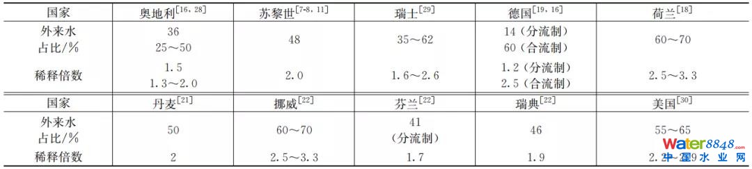 表2 歐洲(和美國)污水管網(wǎng)外來水占比和稀釋倍數(shù)