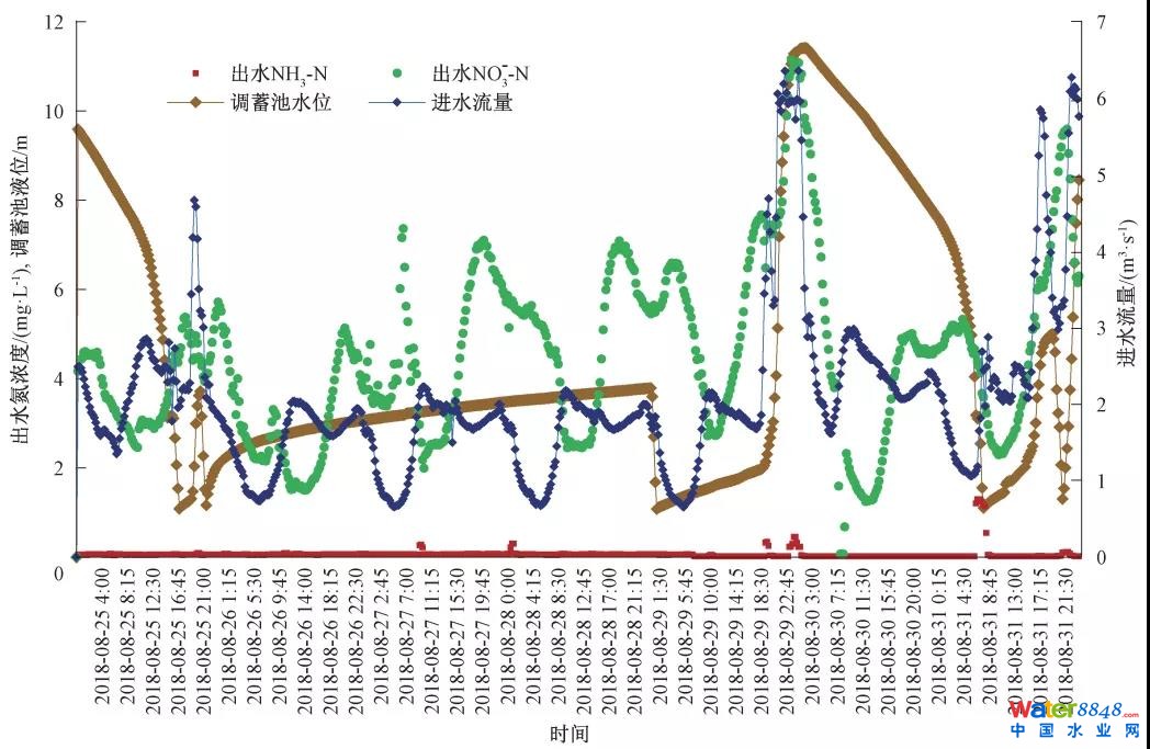 圖2 瑞士蘇黎世Werdhölzli污水處理廠雨季(2018年8月25至8月31日)進水流量、出水氨氮即硝態(tài)氮及調(diào)蓄池水位在線測量數(shù)據(jù)