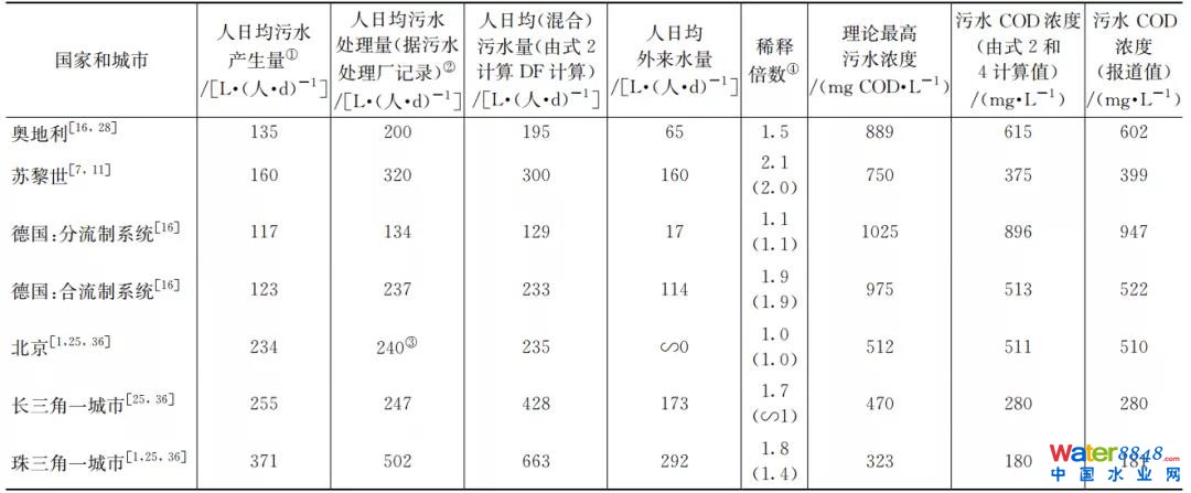 表3 部分歐洲國家和中國的人日均綜合用水量、人日均污水處理量、人日均(混合)污水量及污水COD濃度等相關數(shù)據(jù)