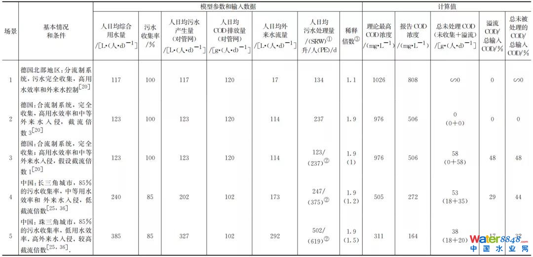 模型被用來描述五個不同的的場景,展示外來水入侵和含外來水混合污水的處理(污水處理廠的處理能力)、用水效率和污水收集率對管網(wǎng)里污水濃度和污染物溢流的影響。模型參數(shù)、輸入數(shù)據(jù)和計算結(jié)果見表4。五個場景中,三個為德國案例:場景1為以分流制排水系統(tǒng)為主的北部地區(qū),場景2和3為以合流制為主的某州。場景1和2中污水處理廠能夠處理所有混合污水。為說明污水處理廠處理能力對溢流控制的重要性并與場景2相比,假定場景3中污水處理廠只能處理1×SCWC混合污水。前三個場景污水都是全收集(X=100%)。兩個為中國案例:長三角和珠三角二個城市,污水收集率均為85%。除了稀釋倍數(shù),其他參數(shù)與表3中長三角和珠三角二城市情況相同,前者因下水道收集的污水流量減少而略高于表3中值。