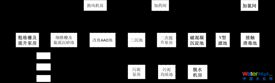 本提標(biāo)改造工程污水處理工藝采用改良AAO+二沉池+二次提升泵房+磁混凝沉淀池(預(yù)留活性炭投加)+V型濾池,污泥處理采用污泥均質(zhì)池+帶式濃縮脫水機(jī),除臭采用生物濾池工藝,具體如圖所示。