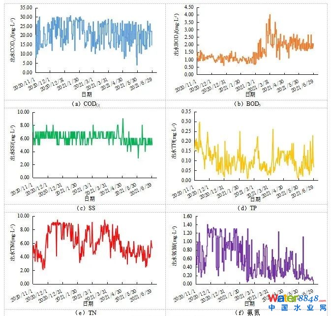 本提標(biāo)改造工程于20206月開(kāi)工,202010月建成通水,202011—20216月實(shí)際日出水水質(zhì)情況如圖所示,各項(xiàng)指標(biāo)均可達(dá)到準(zhǔn)類標(biāo)準(zhǔn)要求。