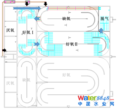 通過(guò)調(diào)整生化池各分區(qū)池容、增設(shè)多點(diǎn)可調(diào)進(jìn)水、重置碳源投加應(yīng)急裝置、增設(shè)混合液回流泵變頻控制、重置曝氣系統(tǒng)等,將現(xiàn)狀常規(guī)AAO池型改造為改良AAO池型,生化處理系統(tǒng)更加穩(wěn)定可靠且可靈活調(diào)控。深度處理段保留V型濾池,增設(shè)加炭磁混凝沉淀池,強(qiáng)化去碳除磷能力,活性炭投加量可根據(jù)實(shí)際運(yùn)行狀況靈活調(diào)配,具有占地小、投資省、運(yùn)行可靠的特點(diǎn)。
