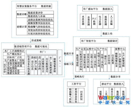 根據(jù)再生水廠對智慧化的程度、需求方面及工期預(yù)算安排協(xié)商出具體需求。該水廠的智慧水務(wù)服務(wù)對象包括廠內(nèi)管理人員、廠內(nèi)生產(chǎn)人員、持有該水廠的集團(tuán)運(yùn)營人員,集團(tuán)工藝工程師,對智慧水務(wù)提出的需求包括角色認(rèn)證、信息展示、智能控制、生產(chǎn)運(yùn)維和決策支持五個方向。另外該水廠的建設(shè)周期較長,且工期要求較緊張,廠內(nèi)智慧化建設(shè)需與和土建、設(shè)備等施工同步實(shí)施,并分步提交廠內(nèi)的信息化、智能化和智慧化建設(shè)階段性成果;诖诵枨,該廠搭建的智慧平臺由單廠感知平臺、單廠智能平臺、單廠工控平臺、單廠移動平臺、集團(tuán)端管理平臺與智慧決策服務(wù)平臺共同組成,如圖1所示。