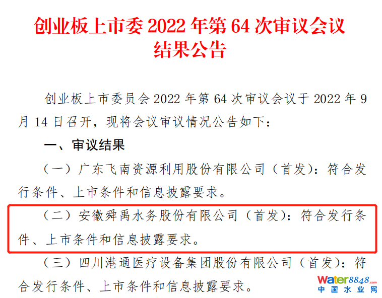 創(chuàng)業(yè)板上市委9月14日召開(kāi)2022年第64次審議會(huì)議,審議結(jié)果顯示,安徽舜禹水務(wù)股份有限公司首發(fā)獲通過(guò)。