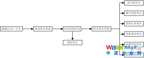 因臨港污水廠的毗鄰企業(yè)——上海天漢環(huán)境資源有限公司地處供水網絡末端且其日常工業(yè)用水體量大,故經雙方協(xié)商,臨港污水廠設置專用的中水泵房及輸送管線,將消毒后的最終出水作為中水供應給天漢環(huán)境,并通過在線儀表實時監(jiān)控中水中的cod、氨氮、總磷、總氮、ph值等水質指標,保障中水水質的穩(wěn)定達標;天漢環(huán)境對中水進行進一步的處理并用于消防、冷卻塔、煙氣洗滌、設備冷卻、設備清洗、地面沖洗和藥劑配置等用途。