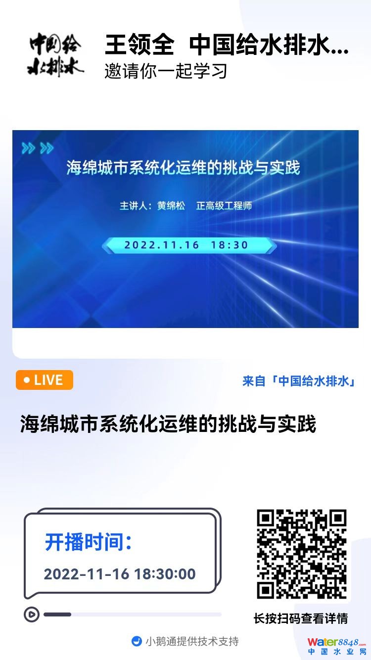 中國給水排水直播:智慧水務與科技創(chuàng)新高峰論壇 直播時間:2023年11月25日(周六) 13:30 2023-11-25 13:30:00 開始 中國水協(xié)團體標準《城鎮(zhèn)污水資源與能源回收利用技術(shù)規(guī)程》宣貫會通知 中國城鎮(zhèn)供水排水協(xié)會