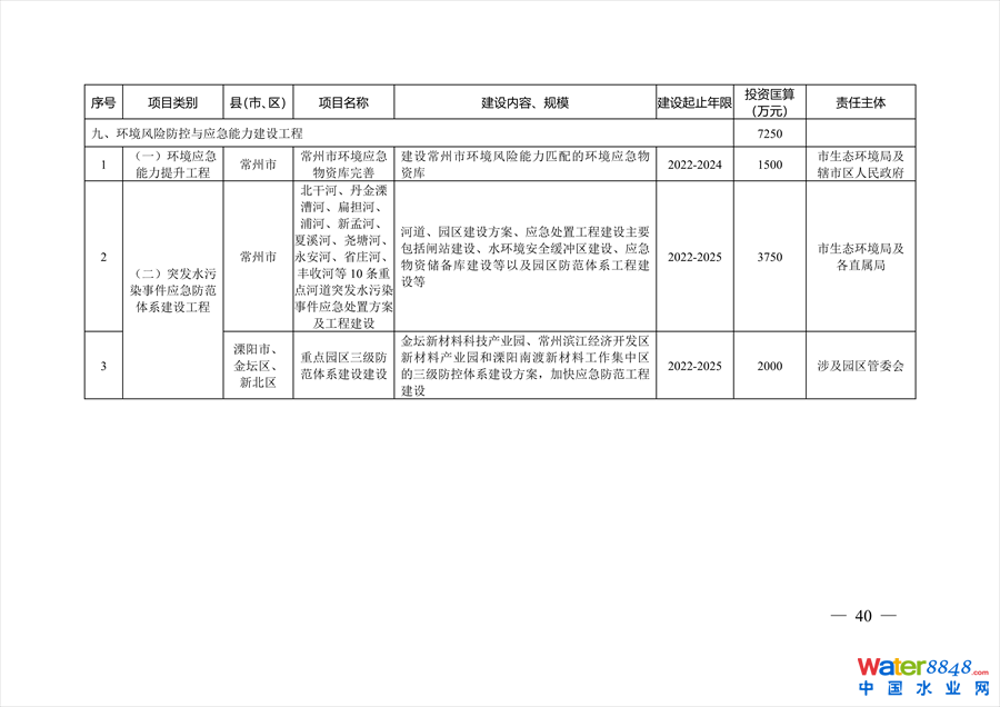 開展突發(fā)水污染事件應(yīng)急防范體系建設(shè)。圍繞全市長江、太湖、京杭運(yùn)河、飲用水源地等重要敏感目標(biāo)構(gòu)建全市“1+7+N”突發(fā)水污染事件應(yīng)急防范體系(即形成1個(gè)全市突發(fā)水污染事件應(yīng)急防范體系建設(shè)總體實(shí)施方案,各轄市區(qū)、常州經(jīng)開區(qū)7個(gè)板塊具體實(shí)施方案,N條重點(diǎn)河流應(yīng)急處置方案和實(shí)際案例)。2023年底前完成半數(shù)重點(diǎn)河流應(yīng)急防范工程建設(shè);完成全部重點(diǎn)園區(qū)三級(jí)防控體系工程建設(shè),基本建成突發(fā)水污染事件應(yīng)急防范體系。