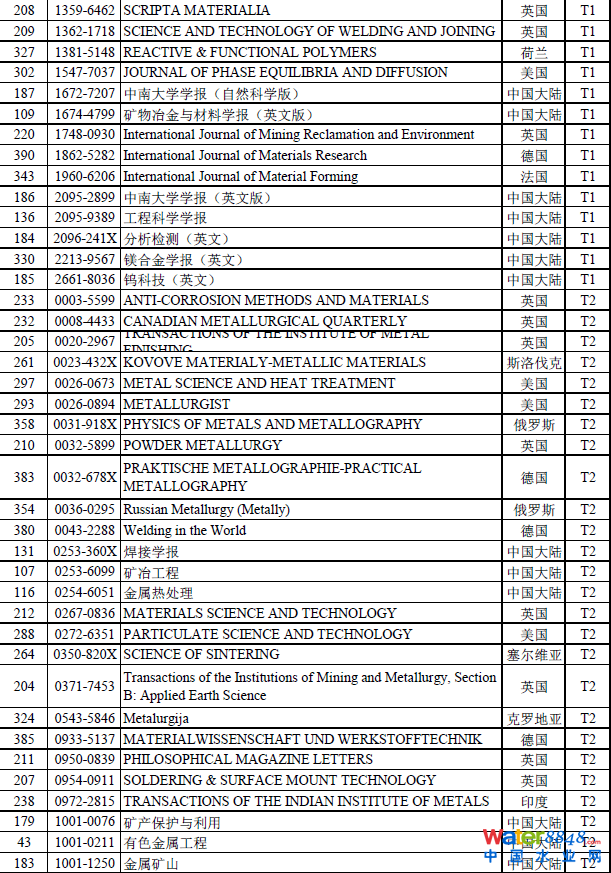 經(jīng)過(guò)期刊挑選、定量評(píng)價(jià)、入選期刊問(wèn)卷查詢?cè)煸L、專家定性評(píng)審、專業(yè)委員會(huì)審議認(rèn)定、學(xué)會(huì)微信公眾號(hào)公示,發(fā)生了有色金屬范疇高質(zhì)量科技期刊分級(jí)目, 總計(jì)212本,其中T1級(jí)別(已經(jīng)接近或具有國(guó)際頂級(jí)水平的期刊)48本、T2級(jí)別(國(guó)際上著名和很是重要的較高水平威望期刊)74本、T3級(jí)別(國(guó)內(nèi)外重要、且被學(xué)術(shù)界所認(rèn)可的期刊)90本。