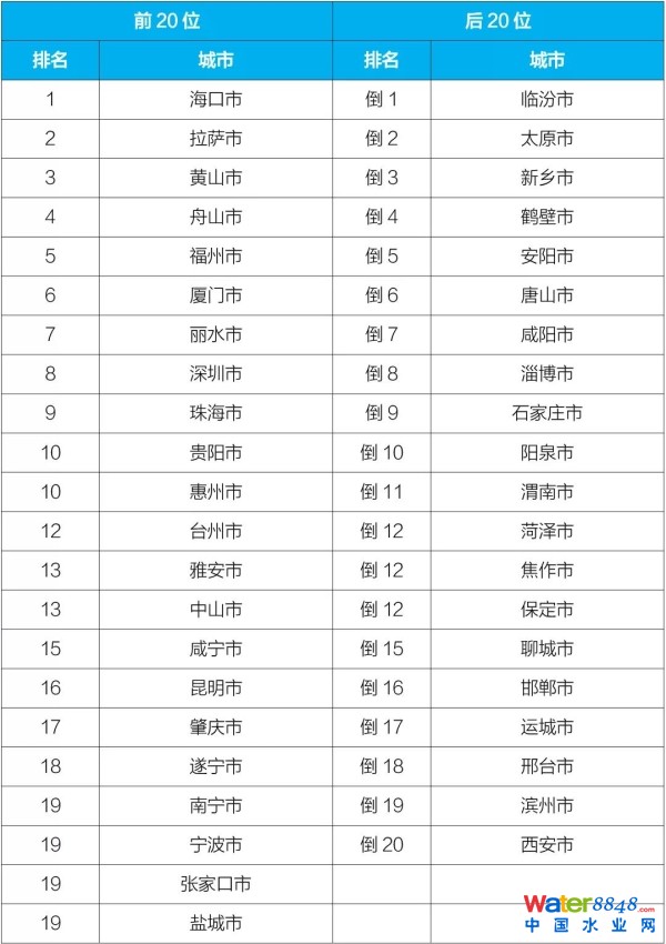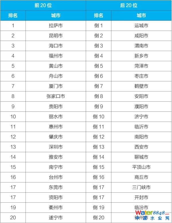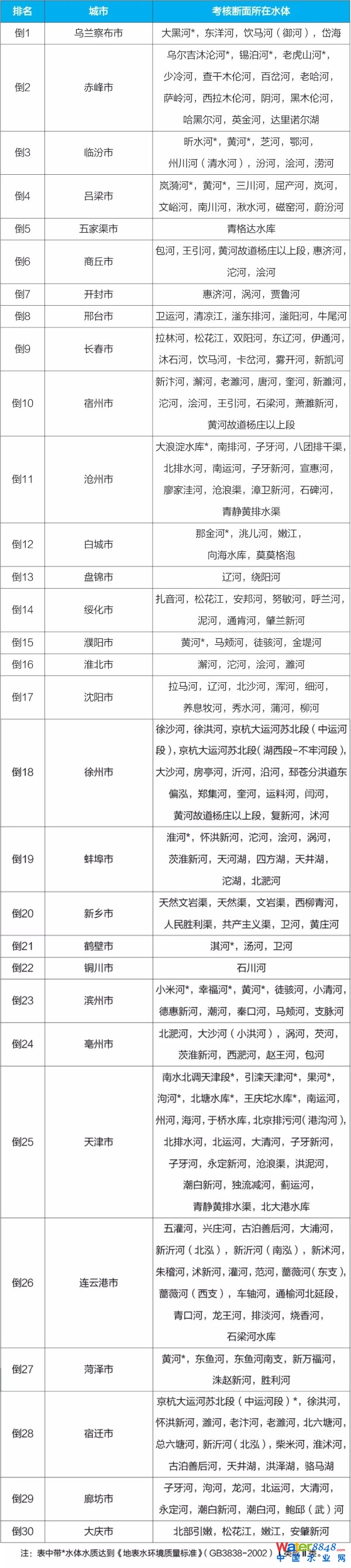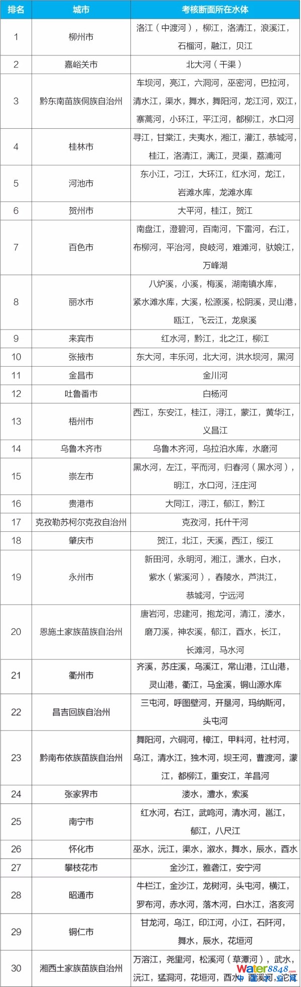 1-11月,全國地級及以上城市中,柳州、嘉峪關(guān)和黔東南等30個城市國家地表水考核斷面水環(huán)境質(zhì)量相對較好(從第1名至第30名),烏蘭察布、赤峰和臨汾等30個城市國家地表水考核斷面水環(huán)境質(zhì)量相對較差(從倒數(shù)第1名至倒數(shù)第30名)。見附表1和附表2。
