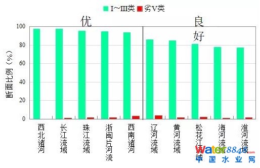 圖4  1-11月七大流域和西南、西北諸河及浙閩片河流水質(zhì)類別比例