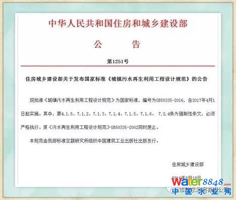 住建部關(guān)于發(fā)布國(guó)家標(biāo)準(zhǔn)《城鎮(zhèn)污水再生利用工程設(shè)計(jì)規(guī)范》的公告