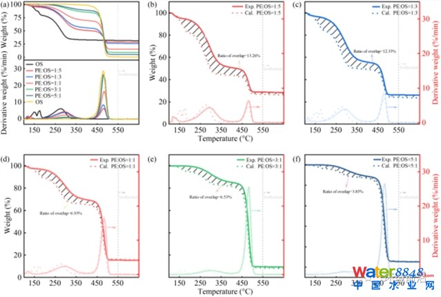 圖2 (a)油泥、聚乙烯塑料及其混合物的熱重曲線;(b)–(f)混合物熱重曲線的實(shí)驗(yàn)值和計(jì)算值的對(duì)比 (圖中OS為油泥,PE為聚乙烯塑料)