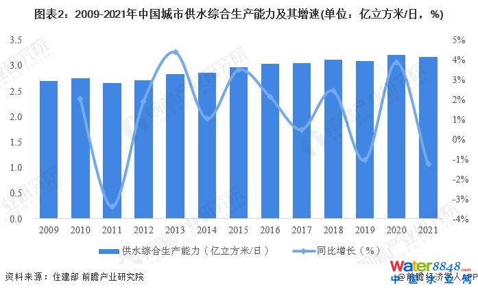 住建部數(shù)據(jù)顯示,2009-2021 年,我國城市供水綜合生產(chǎn)能力整體上升,2020 年為 3.21 億立方米 / 日,較 2019 年上升 3.89%。2021 年我國城市供水綜合生產(chǎn)能力有所下降,為 3.17 億立方米 / 日。