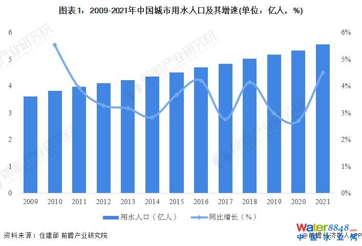隨著城鎮(zhèn)化的深度進(jìn)行,我國城市用水人口總量將持續(xù)上升。根據(jù)住建部發(fā)布的《2021 年城鄉(xiāng)建設(shè)統(tǒng)計(jì)年鑒》,截至 2021 年底,我國城市用水人口達(dá) 5.56 億人,同比增長 4.51%,自 2009 年起城市用水人口穩(wěn)健增加。