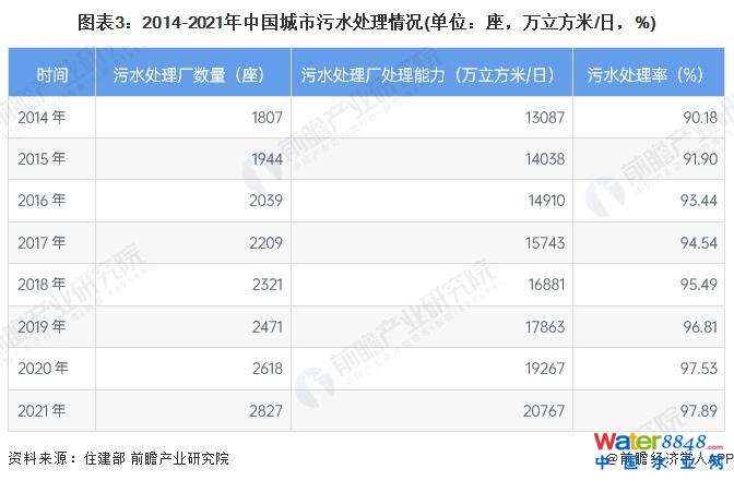 隨著國家對(duì)污水處理的重視,我國城市污水處理廠不斷增加,污水處理廠日處理能力和污水處理率逐漸提高。2021 年,我國城市污水處理廠達(dá)到 2827 座,污水處理廠處理能力達(dá) 20767.22 萬立方米 / 日,污水處理率高達(dá) 97.89%。