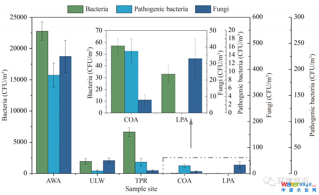 圖2 五個采樣點的生物氣溶膠排放水平(AWA生產工作區(qū)、ULW卸載碼頭、TPR運輸?shù)缆、COA覆蓋區(qū)、LPA滲濾液池區(qū))