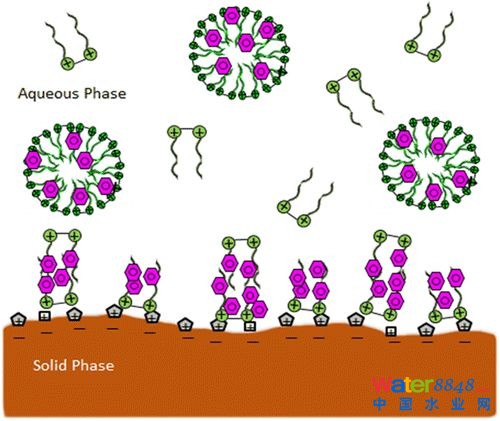 摘要:選用三種具有不同碳鏈的對(duì)稱及不對(duì)稱結(jié)構(gòu)雙子表面活性劑(C 12-2-16、C 12-2-12、C 12-2-8),以一種多環(huán)芳烴為目標(biāo)物,研究雙子表面活性劑不同構(gòu)效關(guān)系對(duì)多環(huán)芳烴在水-顆粒界面吸附、解吸、分布、遷移的影響。研究發(fā)現(xiàn)對(duì)于吸附了雙子表面活性劑的土壤顆粒,對(duì)于萘的吸附行為遵循C 12-2-16 < C 12-2-12 < C 12-2-8。但是綜合兩個(gè)方面考慮(高的滯留性能和較低的投放量),最佳的吸附介質(zhì)是C 12-2-12。對(duì)于小于表面活性劑臨界膠束濃度(CMC)和大于CMC時(shí),多環(huán)芳烴在水-土壤顆粒表面分布及遷移是兩種截然不同的狀態(tài),可以分為幾個(gè)步驟:當(dāng)小于CMC時(shí),陽(yáng)離子雙子表面活性劑的帶電荷部分與土壤帶負(fù)電荷的顆粒相結(jié)合,形成一層界面,而疏水基部分還可以與其他表面活性劑的疏水基鏈接,形成第二層界面。而在界面之間,則有少量的疏水性多環(huán)芳烴與疏水基鏈相結(jié)合。隨著雙子表面活性劑的繼續(xù)加入,大于CMC時(shí),多余的雙子表面活性劑則在溶液中形成膠束,可以溶解大量的多環(huán)芳烴,還能將固體顆粒界面上吸附的多環(huán)芳烴解吸于膠束中。