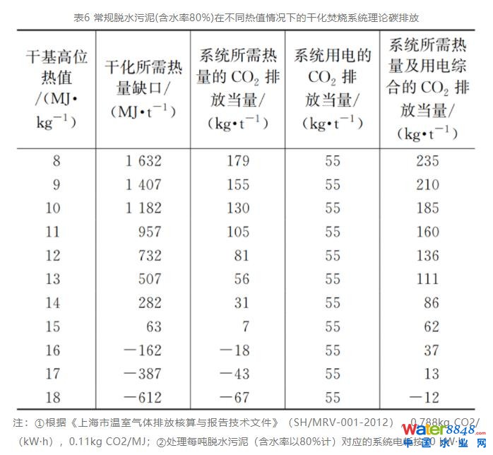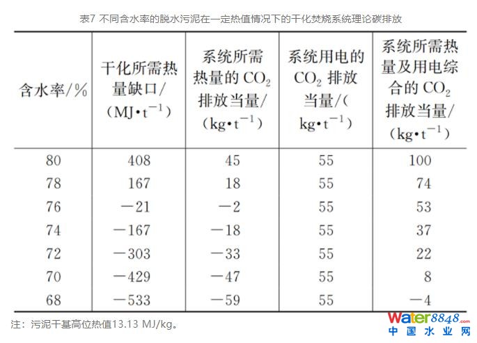 從表4~表7可見,污泥熱值及進(jìn)污泥干化焚燒系統(tǒng)的含水率會(huì)顯著影響系統(tǒng)熱平衡。其中,進(jìn)系統(tǒng)的污泥含水率對(duì)熱平衡的影響更為顯著,在較低污泥熱值的條件下可通過降低進(jìn)系統(tǒng)的污泥含水率實(shí)現(xiàn)系統(tǒng)的熱平衡。隨著污泥熱值的逐步提高,污泥單獨(dú)焚燒的碳排放會(huì)相應(yīng)得到優(yōu)化。