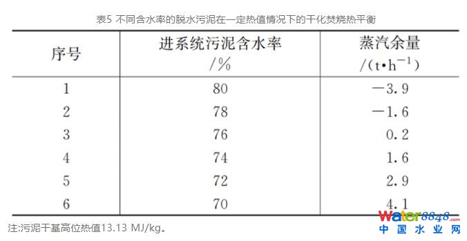 以下結(jié)合工程實(shí)踐,統(tǒng)一基于100 tDS/d的處理量,分別定量給出了常規(guī)脫水污泥(含水率按80%)在不同熱值情況下的干化焚燒熱平衡、不同含水率的脫水污泥在一定熱值情況下的干化焚燒熱平衡、常規(guī)脫水污泥(含水率按80%)在不同熱值情況下的干化焚燒系統(tǒng)理論碳排放、不同含水率的脫水污泥在一定熱值情況下的干化焚燒系統(tǒng)理論碳排放,見表4~表7。